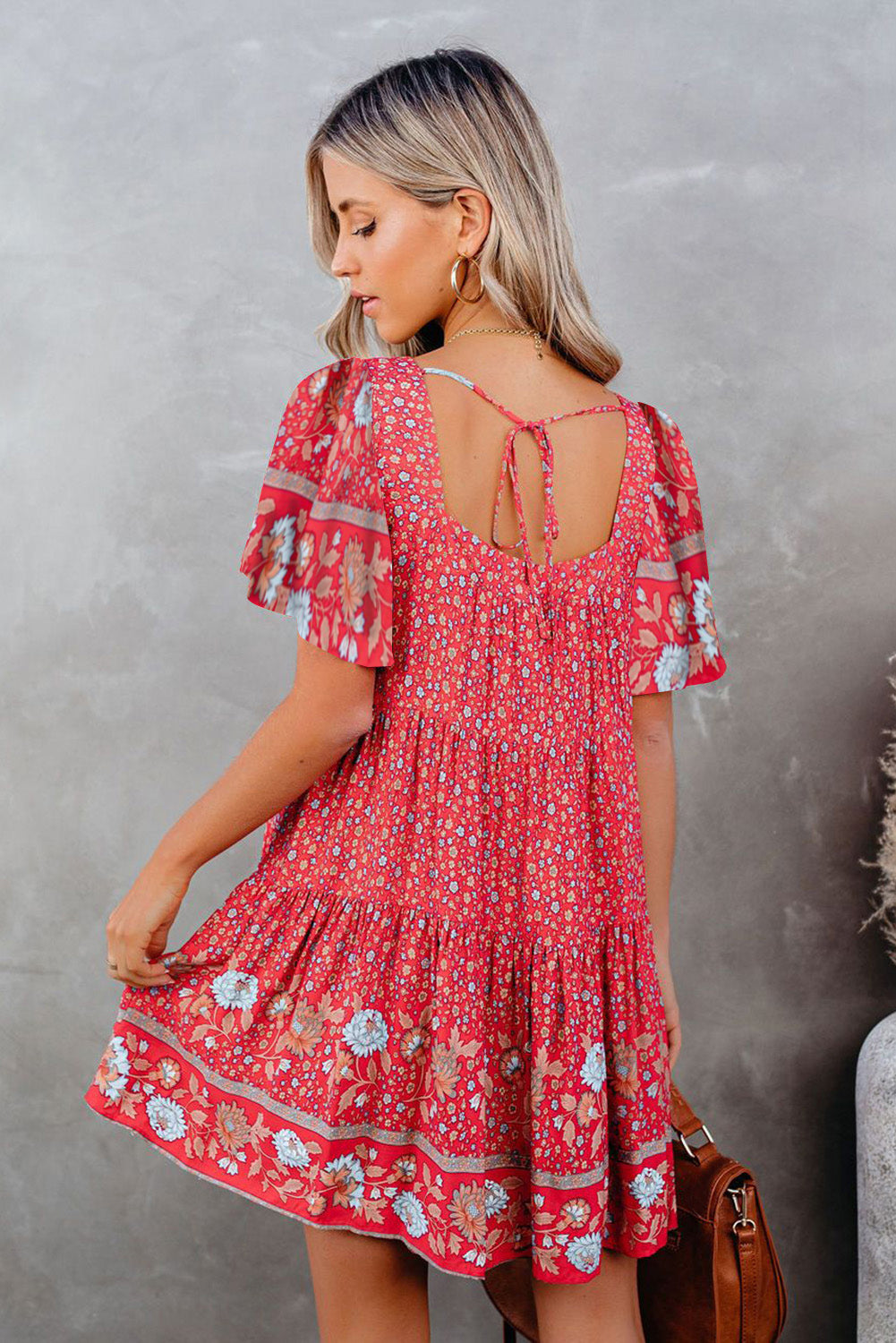 ?This charming floral dress has a unique square neck and graceful flutter sleeves
