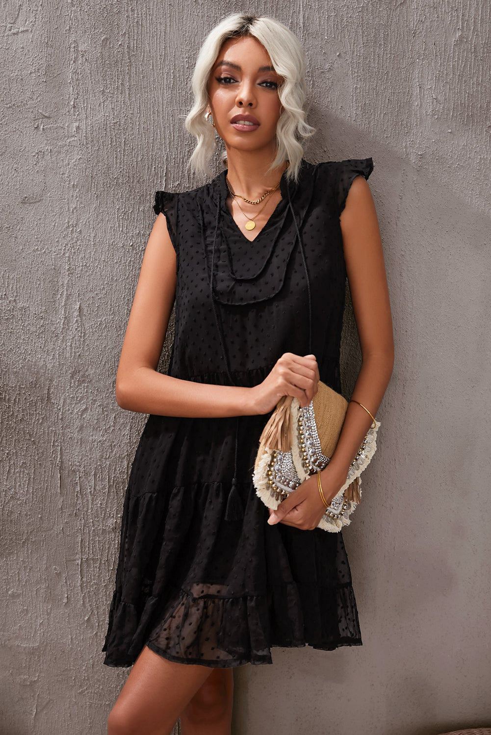 •Our Swiss Dot Tiered Babydoll Mini Dress comes in plain color with a relaxed fit