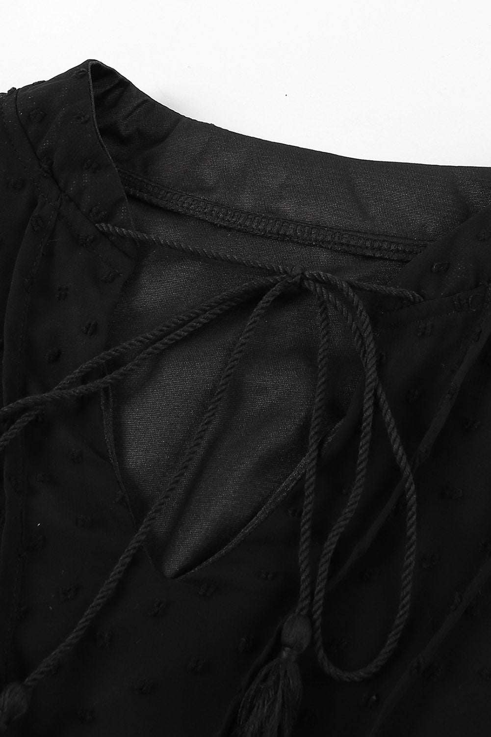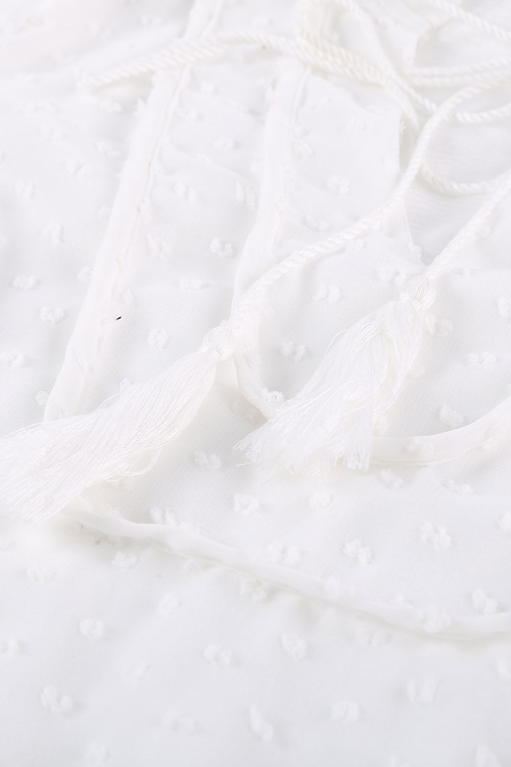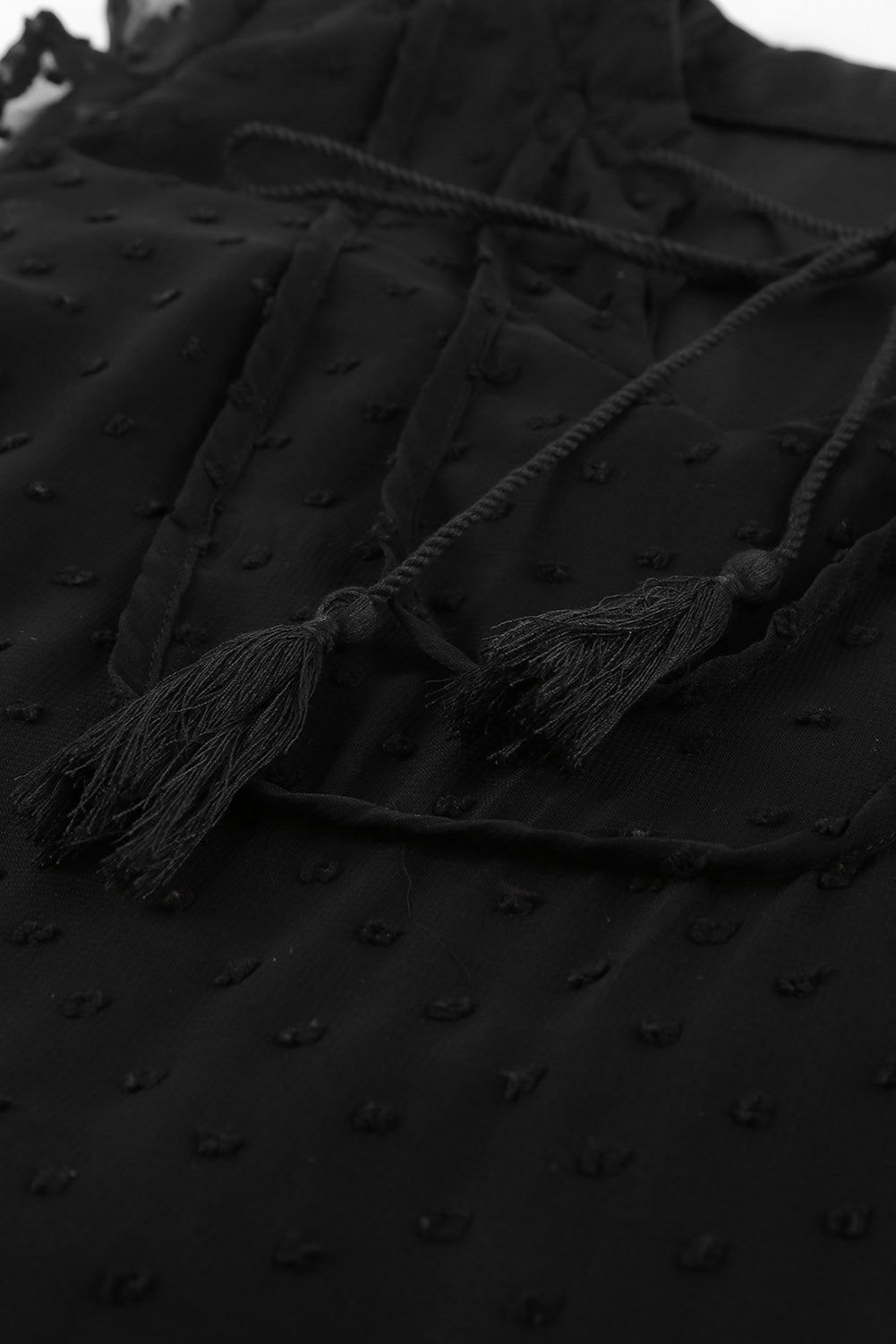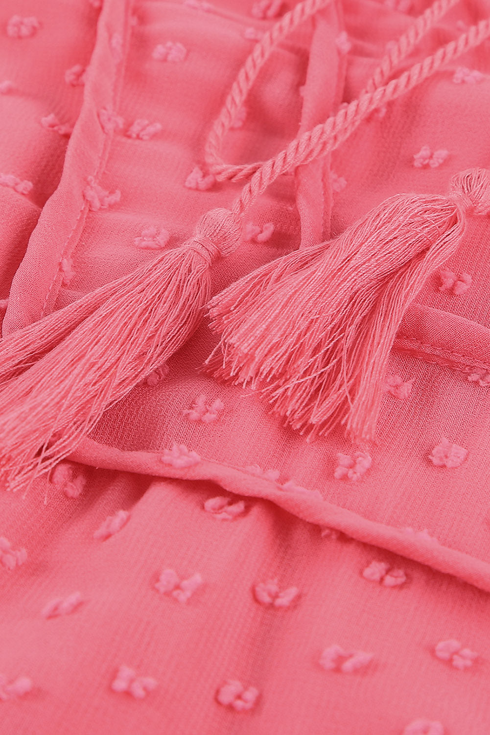 •A split neck with tassel tie closure and finished with ruffle sleeves and a tiered body