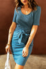 •Short sleeve, sheath silhouette, back slit and calf-length finished