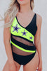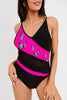 •V neck, adjustable straps and mesh splicing color block swimwear